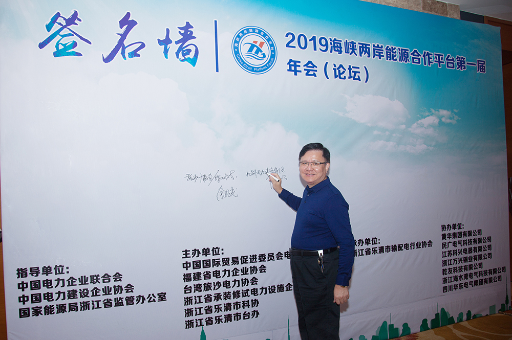 2019年10月18日集團總裁陳光明、執行總裁陳磊、副總裁王寶鐵和總裁助理戴霓寧一行4人應邀前往浙江樂清參加由中國國際貿易促進委員會電力行業委員會、福建省電力企業協會、臺灣旅沙電力協會等單位主辦,浙江省樂清市輸配電行業協會承辦的2019海峽兩岸能源合作平臺第一屆年會。